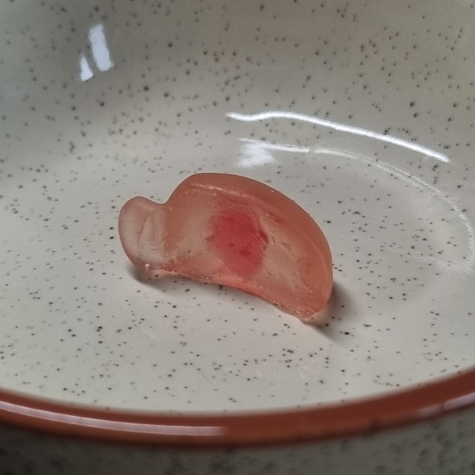 좀 아쉽다. 리치라는 과일이 애초에 그렇게 임팩트가 강한 맛은 아니라서 그런 걸지도 모르겠다. 근데 이건 그냥저냥 그랬다. 사진을 위해서 이빨로 반을 잘라서 한 장 찍어보았다. 안에 흰 젤리는 정말 리치 느낌이 난다. 맛 구현은 잘한 것 같다. 근데 뭐랄까.. 리치라는 과일을 내가 원래 안 좋아하나? 아무튼 그렇게 매력적인 맛은 아니었다. 다시 사먹을 것 같지는 않은 맛. 맛 구현은 잘했고 식감도 말랑말랑하니 좋은데 과일의 문제인가보다. 내가 키위알맹이 때문에 너무 기대해서 그런걸수도 있다. 좀 아쉽네.. 쩝... 그래도 자매품으로 나온 자두 알맹이, 포도 알맹이는 먹어볼 것이다. 알맹이 시리즈는 다 괜찮을 것 같은 느낌이 든다..!