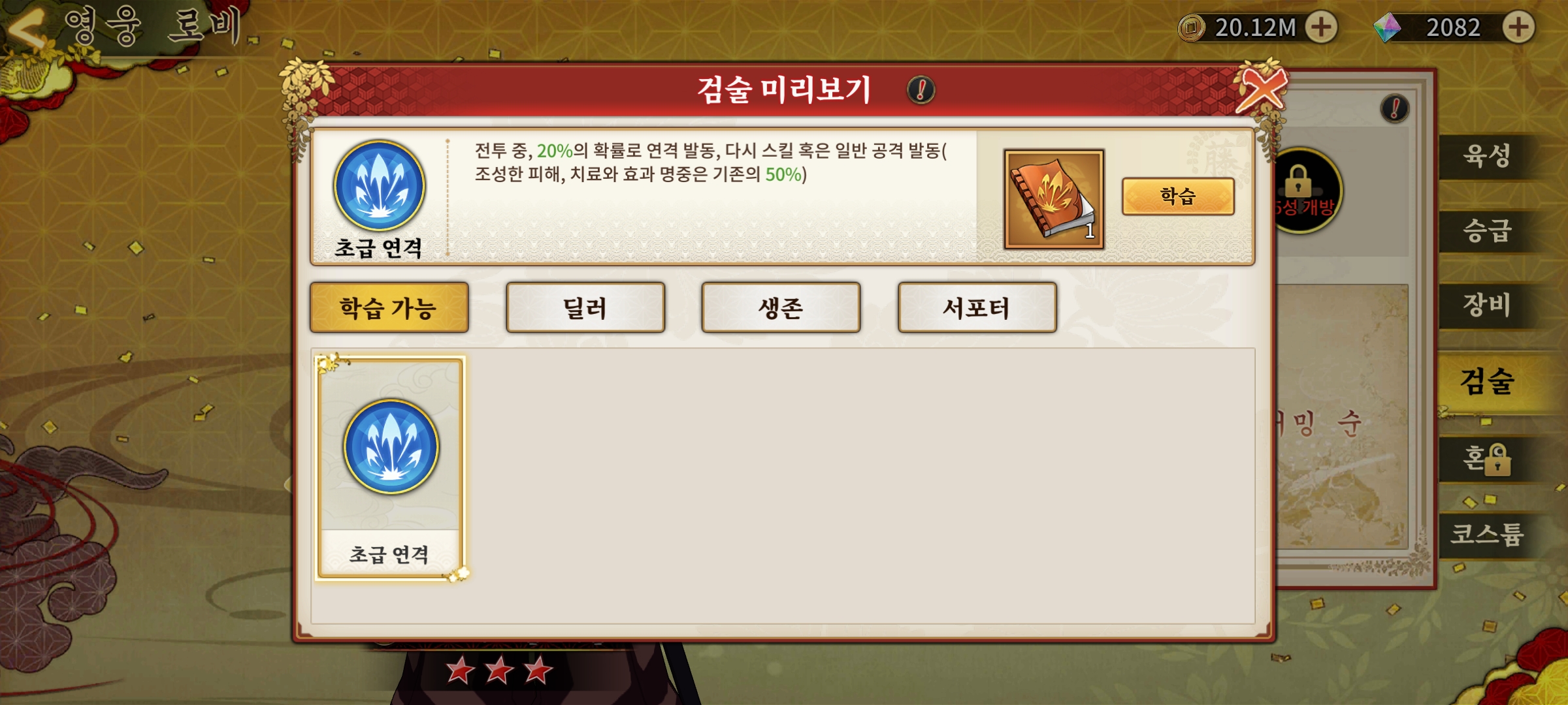 그리고 캐릭터 별로 검술을 배울 수 있는데, 스킬들을 좀 읽어보니 개인적으로 연격이 가장 사기인 것 같다. 비록 두 번째 공격은 좀 약한 느낌이 있지만 그래도 메인 궁극기 같은 경우 두 번 쓰는 거 되게 치명적이다. 랭커들 캐릭터 창을 열어봐도 많은 분들이 연격을 쓰고 있더라.