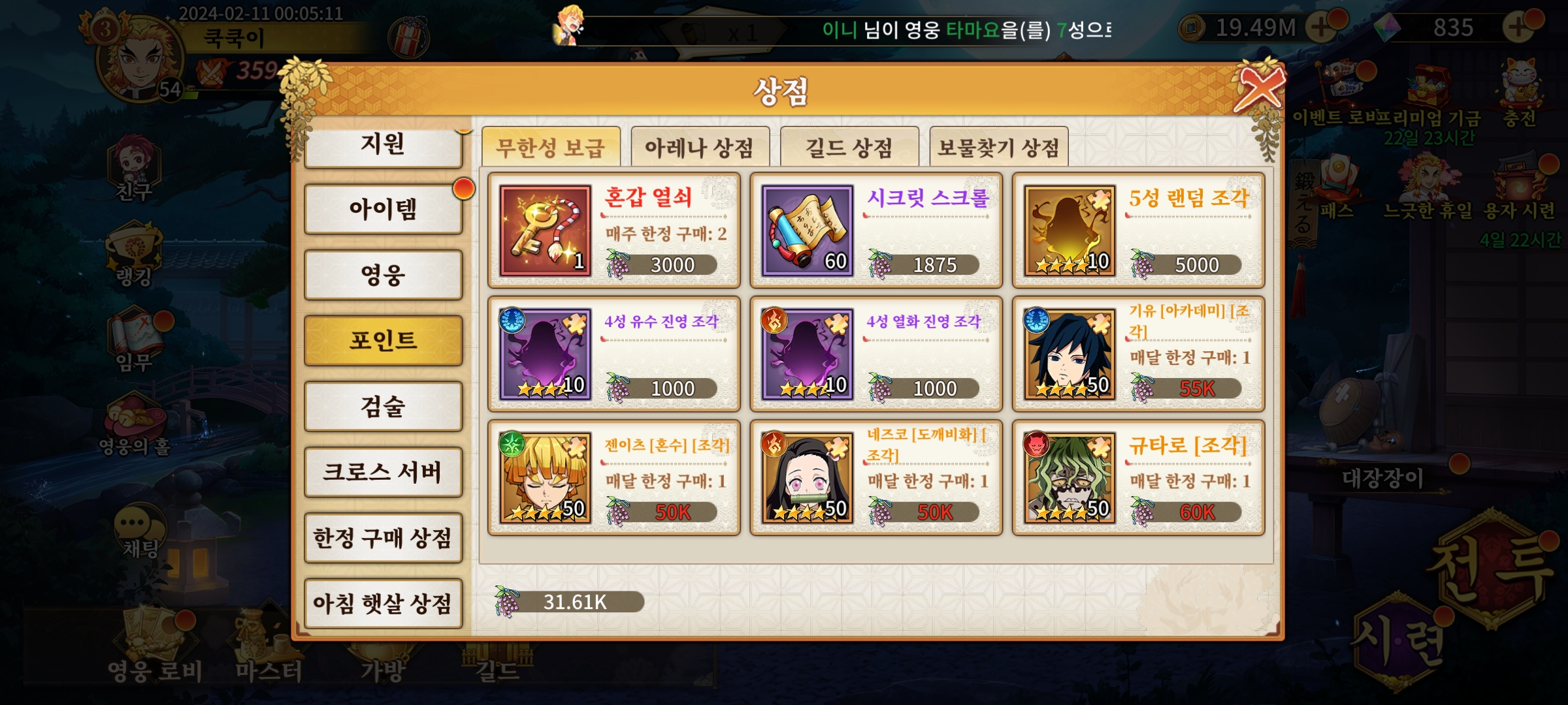얻기 어려운 혈귀 영웅들은 이렇게 포인트 상점에서 볼 수 있다. 무한성 컨텐츠는 이틀에 한 번 열리는데 한번 풀로 돌 때마다 대략 5000개정도 모인다. 그리고 업적 같은 걸로 종종 많이 뿌려서 초반엔 얻기 쉬울 것이다. 나도 열심히 모아서 오늘 규타로 한 장 뽑았다,,  휴