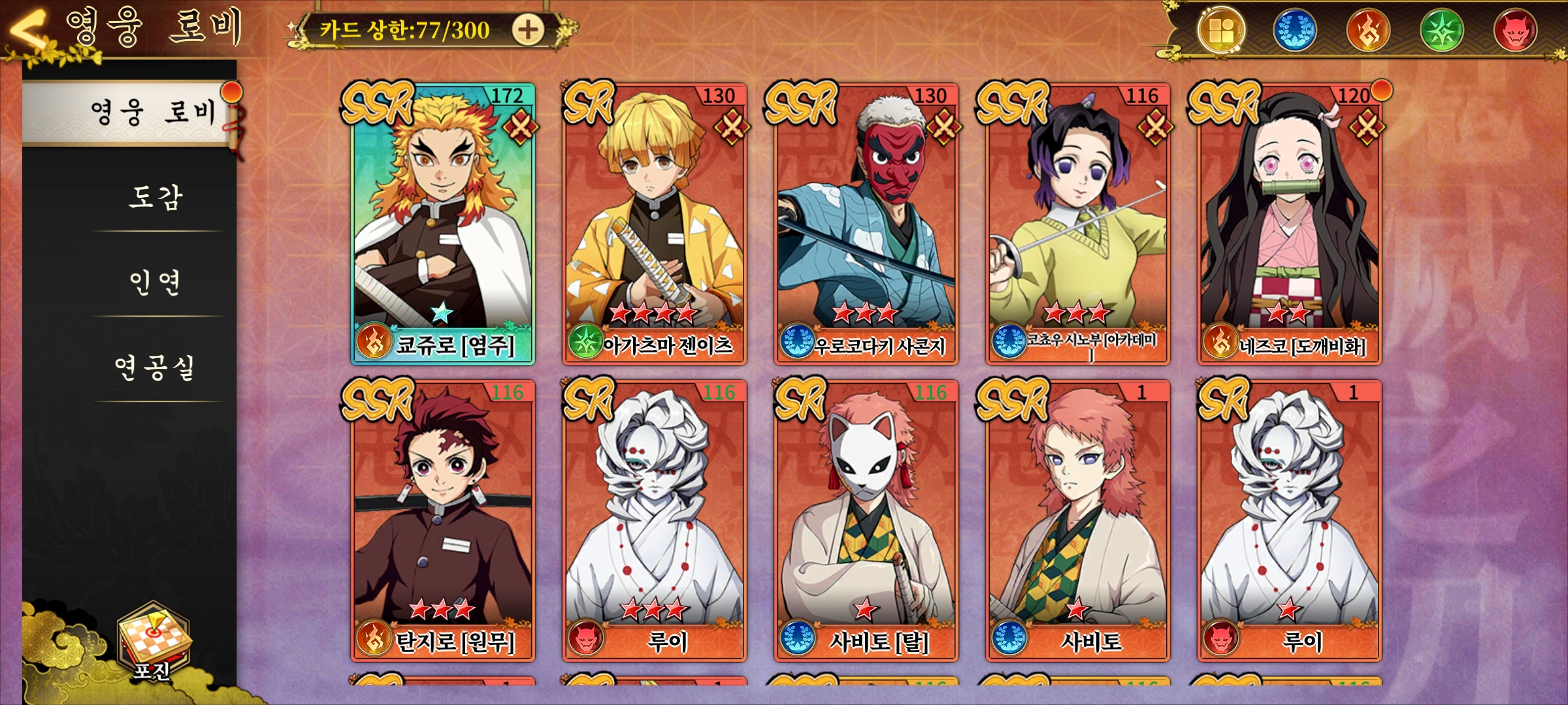 영웅들에는 종족별(열화 유수 풍뢰 혈귀), 포지션(딜러 탱커 서포터)별로 구분되어 있다. 불을 쓰는 느낌이 나면 열화인 경우가 많은데, 그래서 탄지로(원무)나 렌고쿠 쿄주로 같은 주인공 영웅들이 몰려있다. 그런데 육성할 때 같은 종족 재료가 필요하기 때문에 너무 한 종족만 몰아서 키우면 성장이 느릴 수 있다.