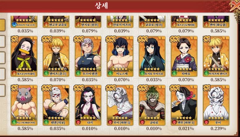 우선 SSR 등급 확률이다. 고급 모집 기준으로 각 SSR 카드들이 등장할 확률은 최대 0.079%, 최소 0.01%이다. 일반적으로 혈귀가 가장 확률이 극악이다. 혈귀 종족 특성상 혼자만 있어도 강해지고 다른 종족보다 버프 효과가 강해서 그런 것 같기도 하다. 다른 이벤트나 교환상점 같은 데에서도 가격이 1.5배쯤 한다. 캐릭터들마다 확률이 다르고, 같은 캐릭터라도 물이냐 불이냐에 따라 확률이 다르기 때문에 선택권 같은 거 있으면 잘 생각해서 뽑아야 할 것 같다.