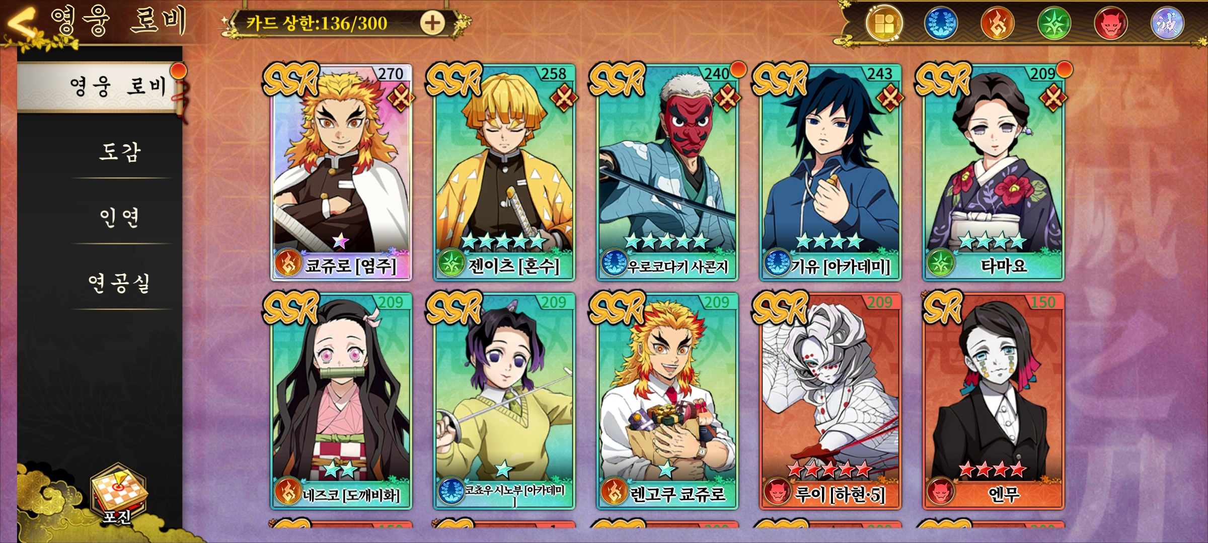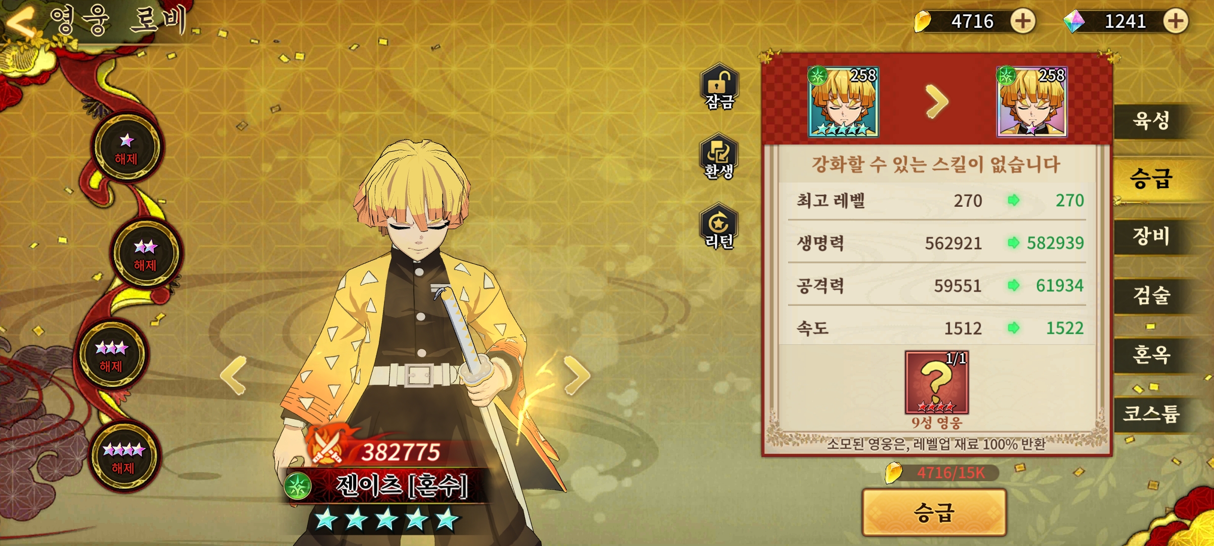 내 근황이다. 쿄쥬로는 거의 다 키웠다고 해도 무방하고, 젠이츠와 기유 위주로 키웠다. 생각보다 젠이츠가 잘 나왔지만 기유는 잘 안 나와서 아직은 14성이다. 14성이 많아지니까 슬슬 진급석이 엄청 부족하더라. 미리미리 많이들 사두시길,,