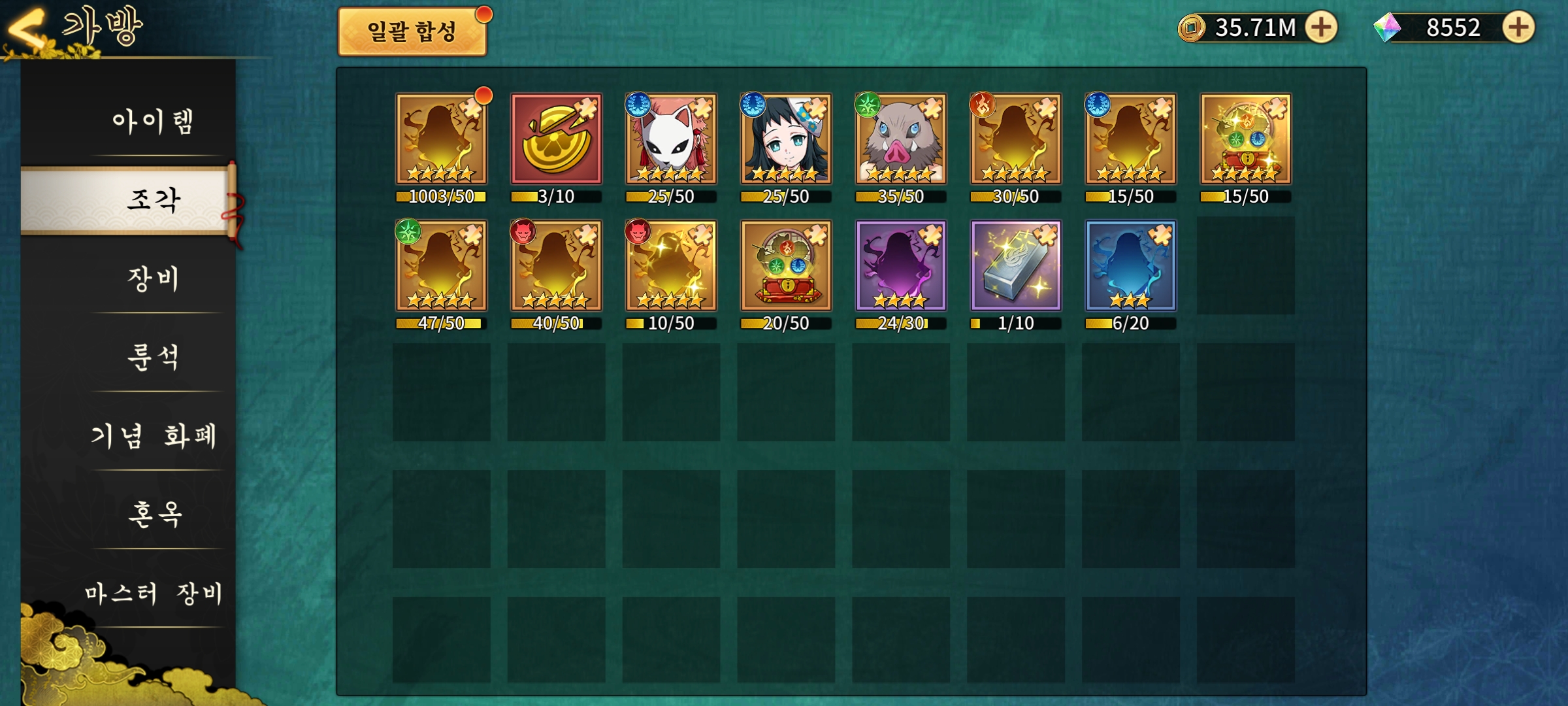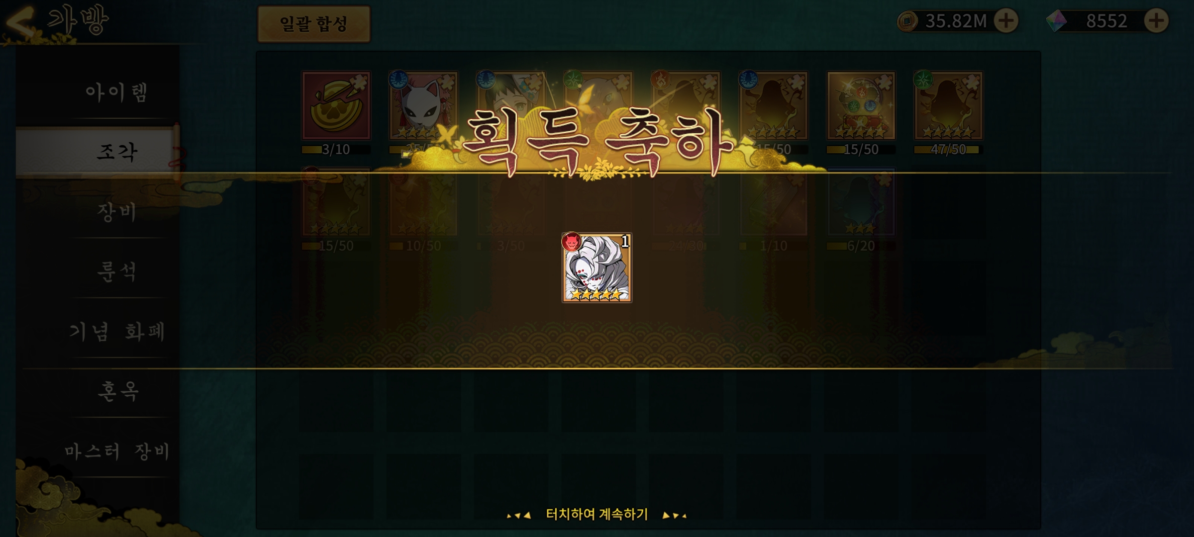 그리고 저번에 혈귀 종족 조각에서 뜬 SSR 루이다. 이게 뜨긴 하는구나 싶었다. 어제는 유수 조각에서 SSR 시노부가 뜨기도 했다.