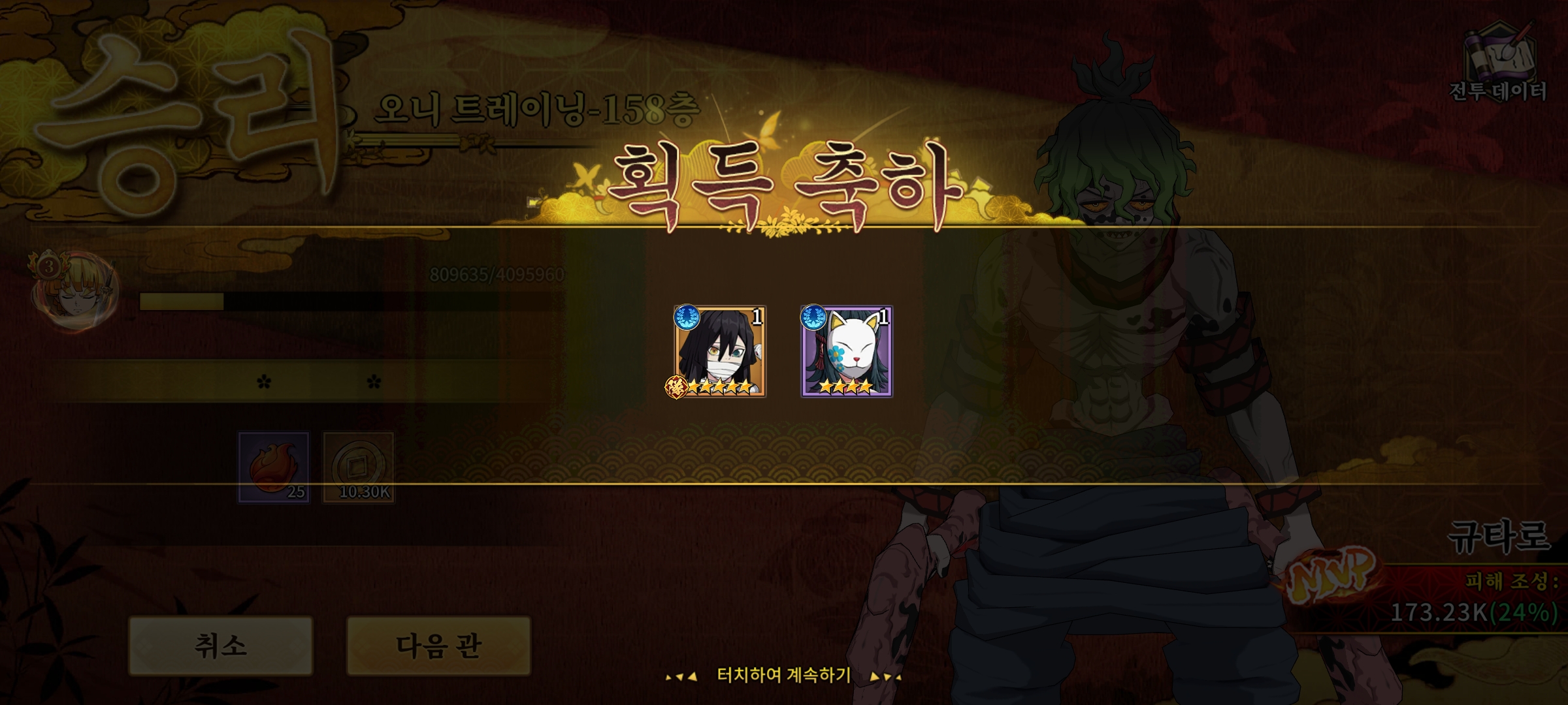 SSR 젠이츠 한 장 떴다. 그래도 하나는 건졌다. 내 생각에 이거 뜨는 SSR이 정해져 있는 것 같다. 혈귀도 루이만 뜨고 아카자 같은 애들은 꿈도 못 꾸는,,