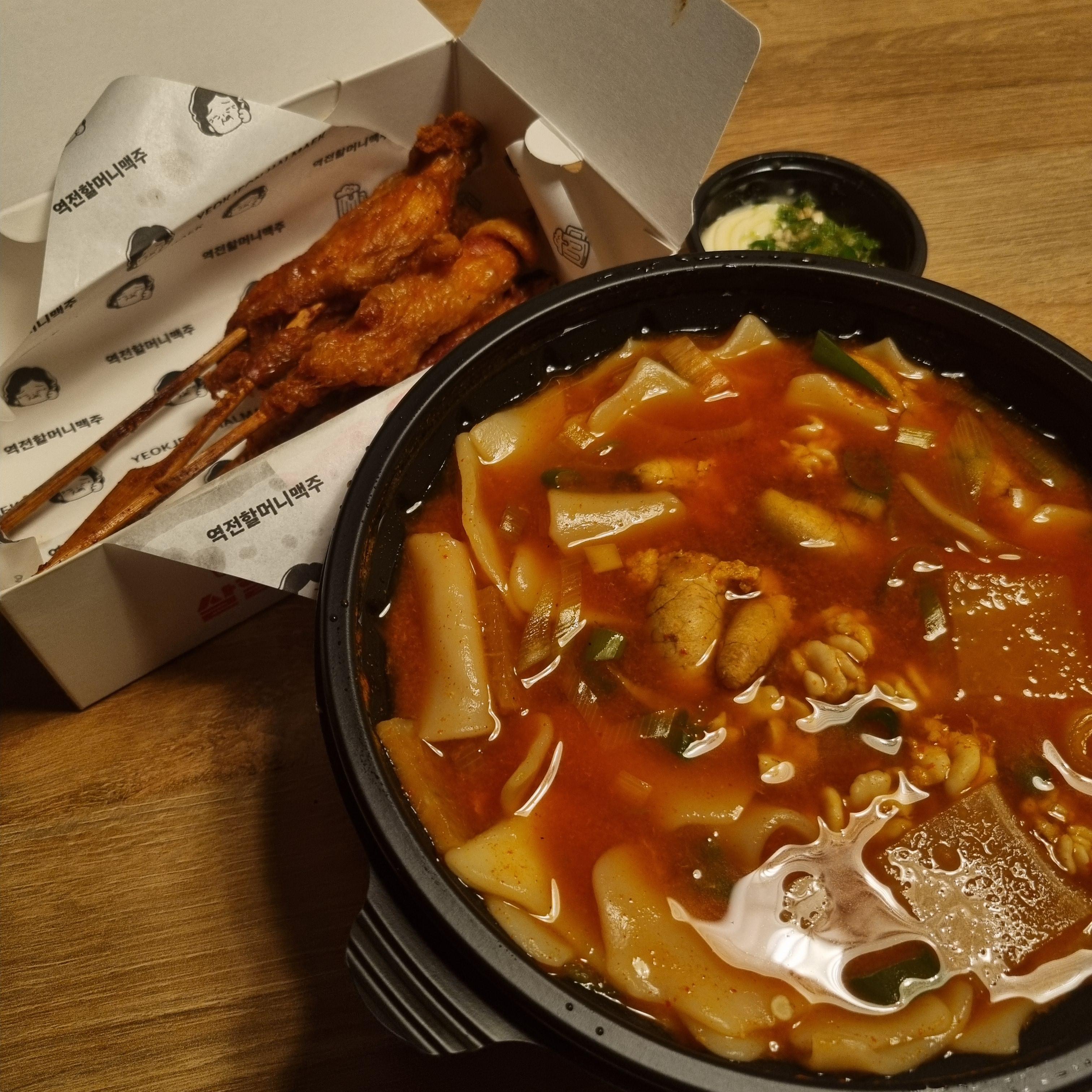 꼬꼬껍질말이는 닭껍질말이 튀김 같은 거고, 얼큰수제비는 알탕 베이스에 수제비를 넣은 것 같다.
