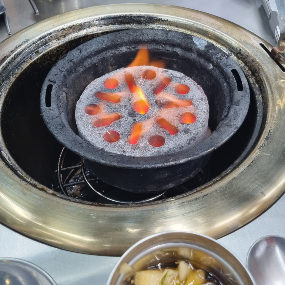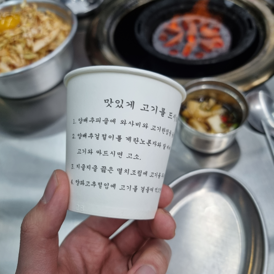 나름의 포인트들을 준 모습이다. 우선 양념 양배추. 보통 다른 고깃집 가면 파채에 파채소스 뿌려서 나오는데 여긴 나름 신경을 썼다. 노른자 터뜨려서 잘 비벼먹으면 시지 않고 달달해서 맛있더라. 그리고 고깃집 근본의 연탄과, 고기 맛있게 먹는 법을 담은 자체적으로 주문한 종이컵. 아주 굿이다. 연탄만 보면 고깃집에서 알바했었을 때가 생각난다. 추억이 새록새록,,