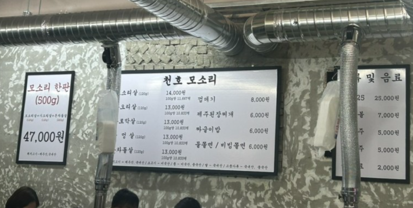 메뉴 구성으로 모소리살, 가오리살, 가로막살 등등 팔고 있는데, 1인분에 120g인 모습이다. 아니 120g??? 라떼는 1인분에 200g이었는데, 어느새 180g에서 점점 줄더니 이젠 120g이 되어버렸다. 진짜 물가상승 체감 제대로다;;